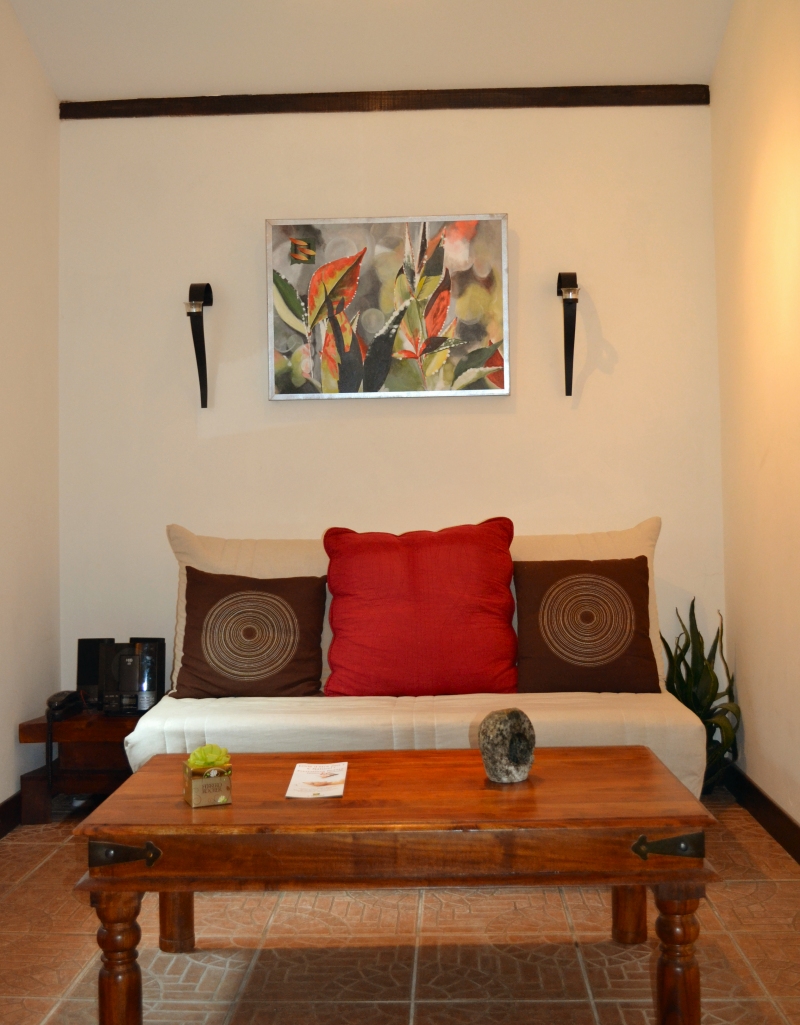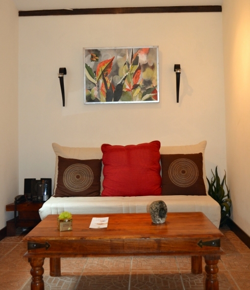Coin salon équipé d'un canapé-lit. Mini chaine et WiFi. Vous disposez d'un frigo laptop et d'une machine à boissons chaudes DolceGusto